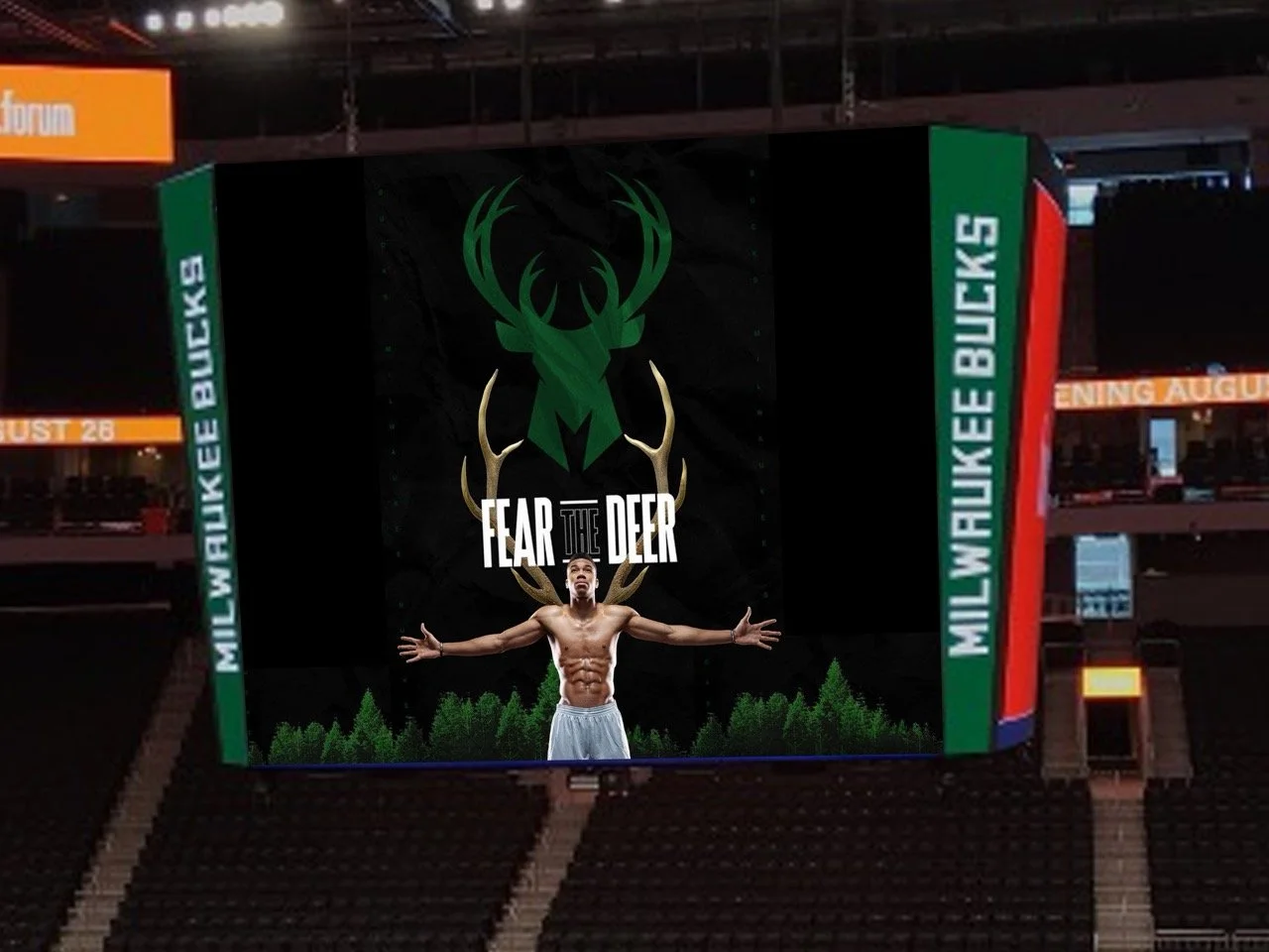 I made this Giannis Antetokounmpo poster from a Bucks wallpaper I found that I wanted to expand. I wanted to visualize the statement, “Fear The Deer”. I searched for a wingspan picture of Giannis and to place wing-like antlers behind him. I found large, realistic antlers to place on his back. I used Photoshop to crop out these elements, then to expand the background to fit on the Milwaukee Bucks jumbo tron. All of the elements I pulled listed below.